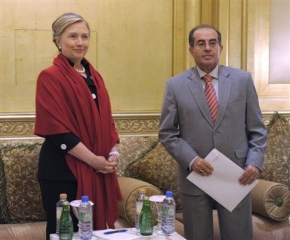 Secretary of State Hillary Rodham Clinton meets with Mahmoud Jibril, executive bureau chairman of the transitional national council in Libya, during a bilateral meeting at the Emirates Palace Hotel in Abu Dhabi, United Arab Emirates, Thursday, June 9, 2011. (AP Photo/Susan Walsh, POOL)