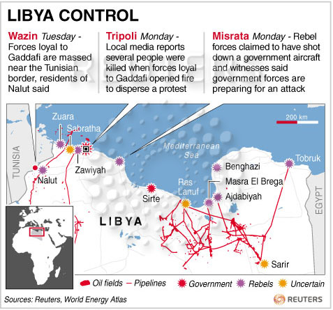 US hardware being used in Libya is thought to include several attack submarines and destroyers (USS Providence, USS Scranton, USS Florida, USS Stout and USS Barry) These carry cruise and Tomahawk missiles that have been fired at Libyan targets. The command ship USS Mount Whitney is also in the Mediterranean to oversee the joint operation. Reconnaissance aircraft RC-135 also deployed as well as E-3 Sentry (AWACS) warning and control aircraft. The US has 42 F-16s at a base in Aviano, Italy. B-2 stealth bombers also used in strikes at the weekend.’ http://www.euronews.com/2011/03/19/international-forces-in-libya