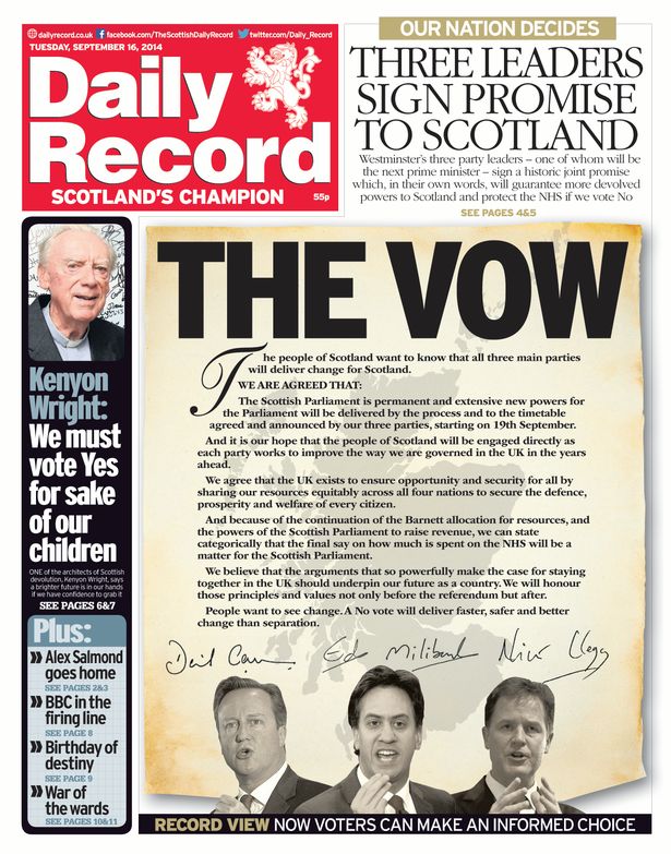 In a further push by the no campaign, all three UK leaders – Cameron, Miliband and Nick Clegg, the Lib Dem leader – signed a front page pledge in the Daily Record newspaper entitled “the vow”. It promised they would give the Scottish parliament a legal guarantee of its independence from Westminster and to protect the Treasury’s funding system, known as the Barnett formula. Along with a “categoric” statement that Holyrood had the final say on Scottish health service spending, both are major new commitments, pushed for by the paper after it accused the three leaders last week of making weak promises on devolution.
