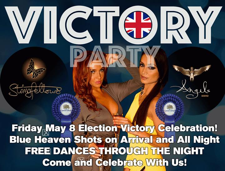 The 2015 general election: On Friday night, while Labour-voting London congregated outside pubs to condemn the outcome of democracy, Tory supporters were celebrating the first majority Conservative government in over 20 years. And what better way to usher in five more years of neglecting the young, sick, old and disabled than by hurling cash at dancers and Dom Pérignon in the capital’s unofficial Conservative Party party HQ: Stringfellows strip club. Stringfellow, a Thatcher fan and the owner of the club he named after himself, was throwing a General Election “Victory Party”. There were no banners outside, no stream of jubilant bankers in cardboard David Cameron masks; just two intimidating bouncers and a very quiet smoking area.