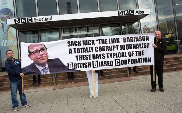 As a crowd demonstrated outside of the headquarters of BBC Scotland on the afternoon of Sunday 13 September, with a banner being used to call for the sacking of the corporation’s political editor, Nick Robinson, the BBC released a statement to deny the accusations that its coverage was biased.
