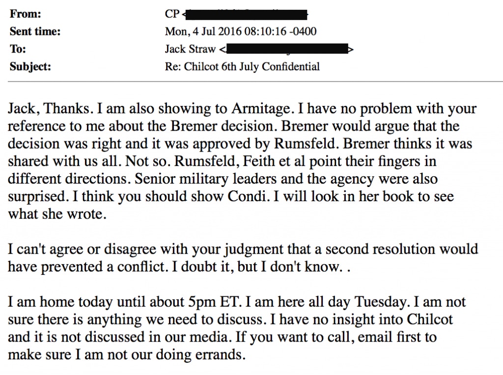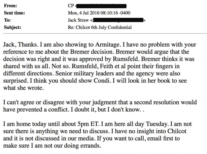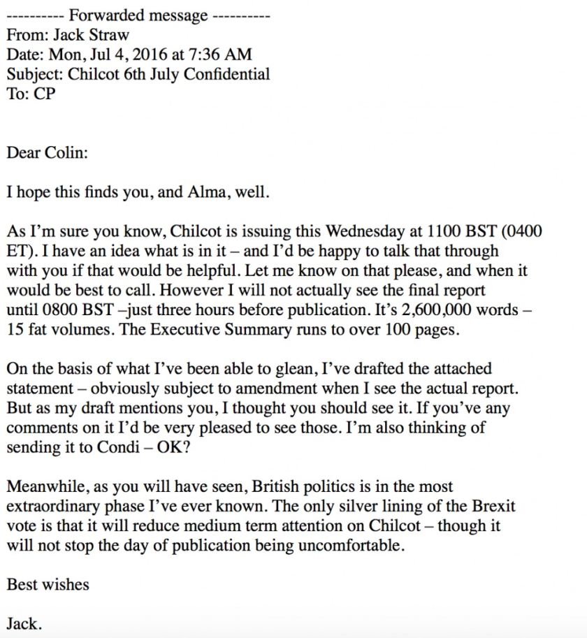 Nearly a month later, on 3 Aug 2016, Powell emailed Straw to tell him that the Chilcot report “didn’t amount to anything over here” and that he assumed the inquiry simply “faded away.”