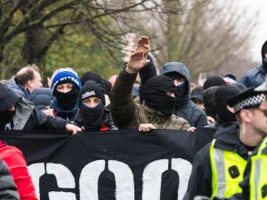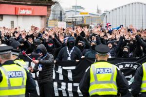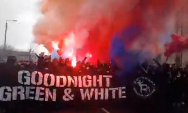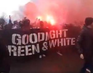 Hundreds joined in a Rangers ultras fans group-organized march promoted by a sectarian hate-filled flyer which also depicted a Celtic supporter being booted on the ground. The, “Goodnight Green and White” banner was draped across a large group of face covered, balaclava-wearing marchers at the front.