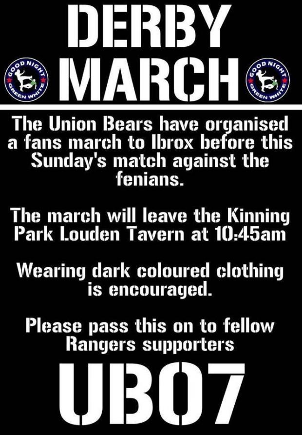 And added: “The Union Bears have organized a fans march to Ibrox before Sunday’s game against the Fenian’s. The march will leave the Kinning Park Louden Tavern at 10.45am. Wearing dark coloured clothing is encouraged. Please pass this on to fellow Rangers supporters. “UB07.”