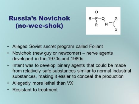 Alleged Soviet secret program called Foliant. Novichok (new guy or newcomer) – nerve agents developed in the 1970s and 1980s. Intent was to develop binary agents that could be made from relatively safe substances similar to normal industrial substances, making it easier to conceal the production. Allegedly more lethal than VX. Resistant to treatment.