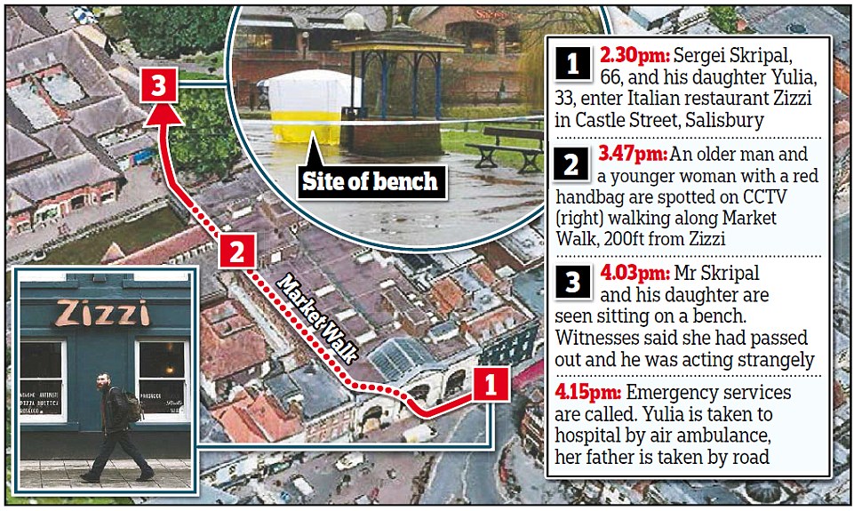 1415 – 1545: In the Italian Zizzi Restuarant. Yulia reportedly opened a “gift from friends” as they consumed a meal. Soon after Skirpal began acting irrationaly.