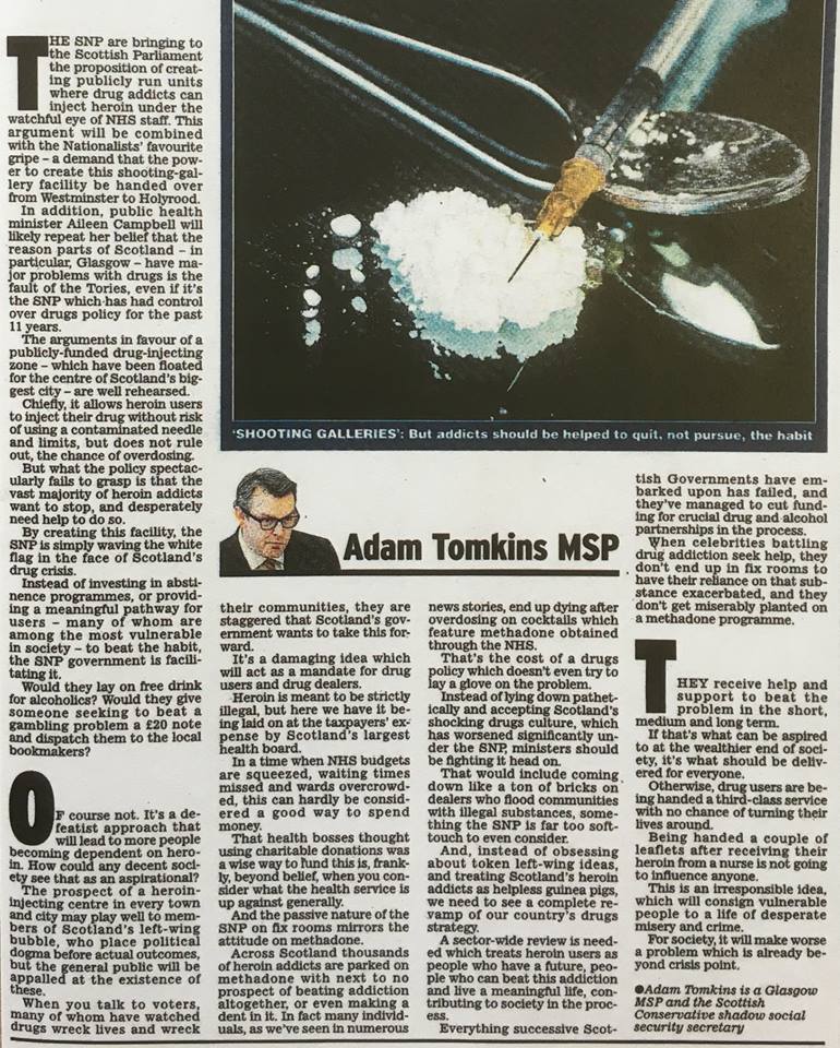 The Express published an article written by Tomkins in which he attacked the SNP government wrongly attributing the proposed introduction of safe facilities to it, cheapening the efforts of highly qualified medics, social services experts and other people determined to improve the lives of drug users. See the article: