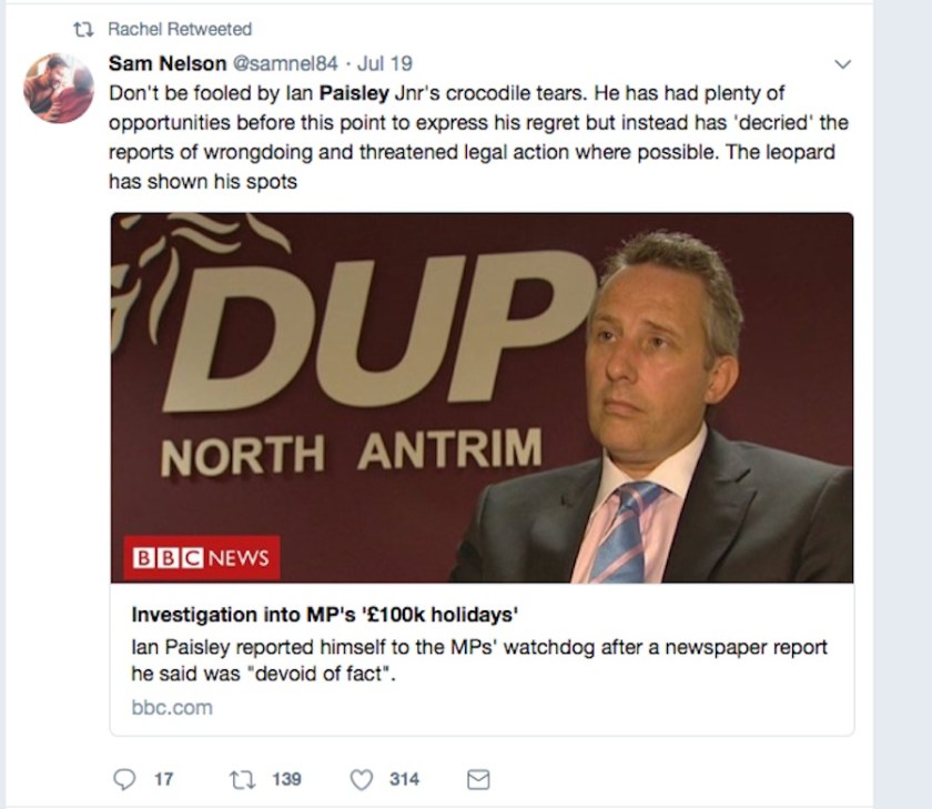 Ian Paisley Jr, a Democratic Unionist Party’s MP, accepted from the Sri Lankan government, (a country he was securing a post-Brexit trade deal with) two all expenses paid trip holidays, worth £200k plus, ,