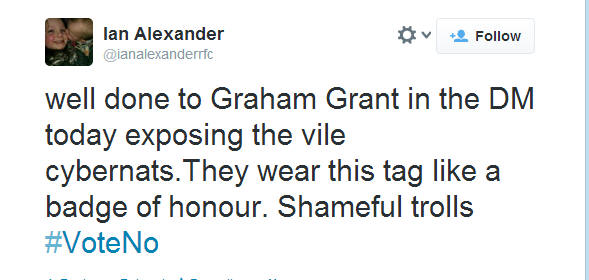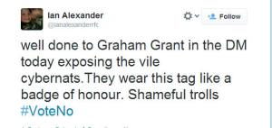 Graham Grant published the results of a Scottish Daily Mail week-long “Probe” into “vile” Cybernats, which actually turned out to be an excuse to doorstep, photograph in the street and published prurient details about ordinary Scots who happen to support independence and most of whom have never tweeted anything remotely offensive in their lives.