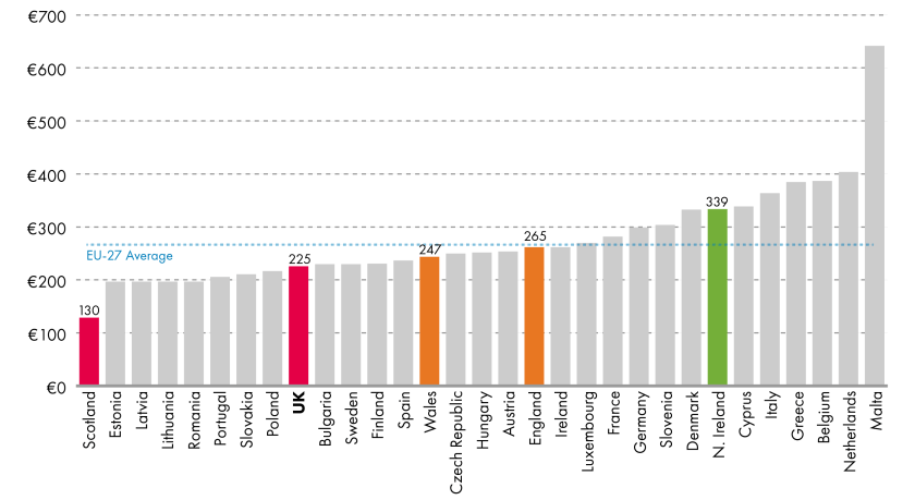 Scotland now has the lowest amount of direct farm funding, per hectare of farmland, in the EU.