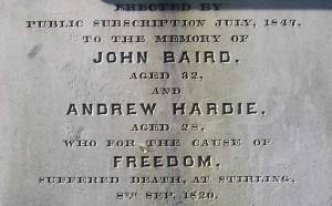 Barely a week later, on 8th September 1820, Andrew Hardie, from Glasgow, who told the spectators, (‘I die a martyr to the cause of truth and injustice’) and John Baird, from Condorrat, met the same fate in Stirling.