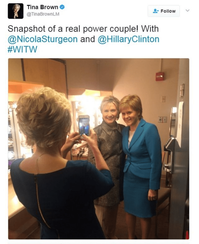In the course of the grand tour, Sturgeon and Hillary Clinton both addressed the “Women in the World” summit and, prior to meeting “trailblazer” Clinton, Sturgeon exclaimed “I’ve got to be careful I don’t act like a fangirl.” before posing for publicity photos together. Journalist Tina Brown, who founded the event, also shared a photograph of herself with the political “power couple”, calling them “two women I admire most anywhere”. So all bestie friends together.