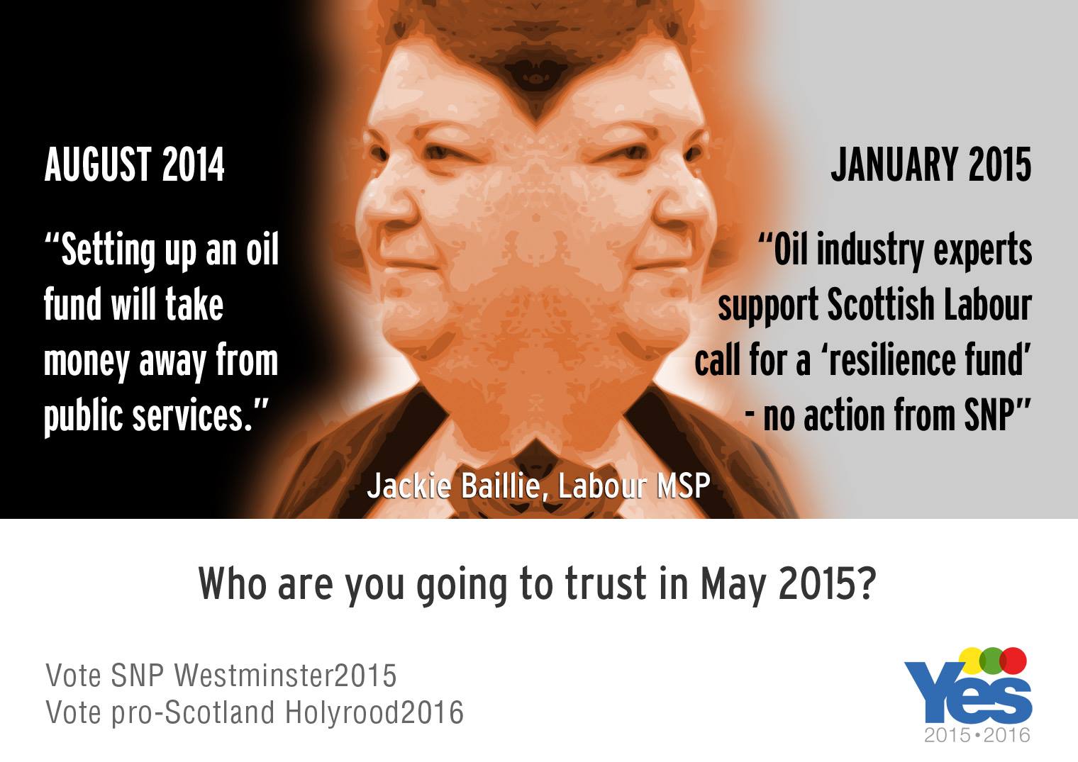 Feb 2015: Jackie Baillie, ever willing to claim credit for the good works of others had the audacity to make claims in the press that it had been her intervention that had saved the day for Scots forcing the SNP government to find recurring finance cancelling out the effects of the Bedroom Tax. The brazen bid for glory exposed her to the ridicule of the Scottish electorate who were well aware that £30m had to be diverted away from the Scottish health Service to fund the new tax burden. the Scottish electorate.