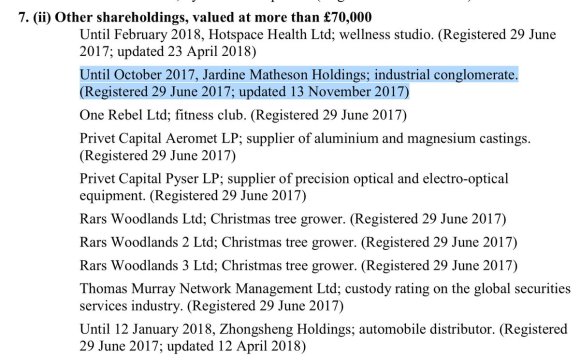 Scottish Tory MP has over £70,000 of shares invested in Jardine Matheson Holdings (JMH), which is incorporated in Bermuda.