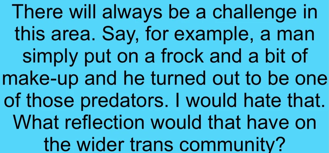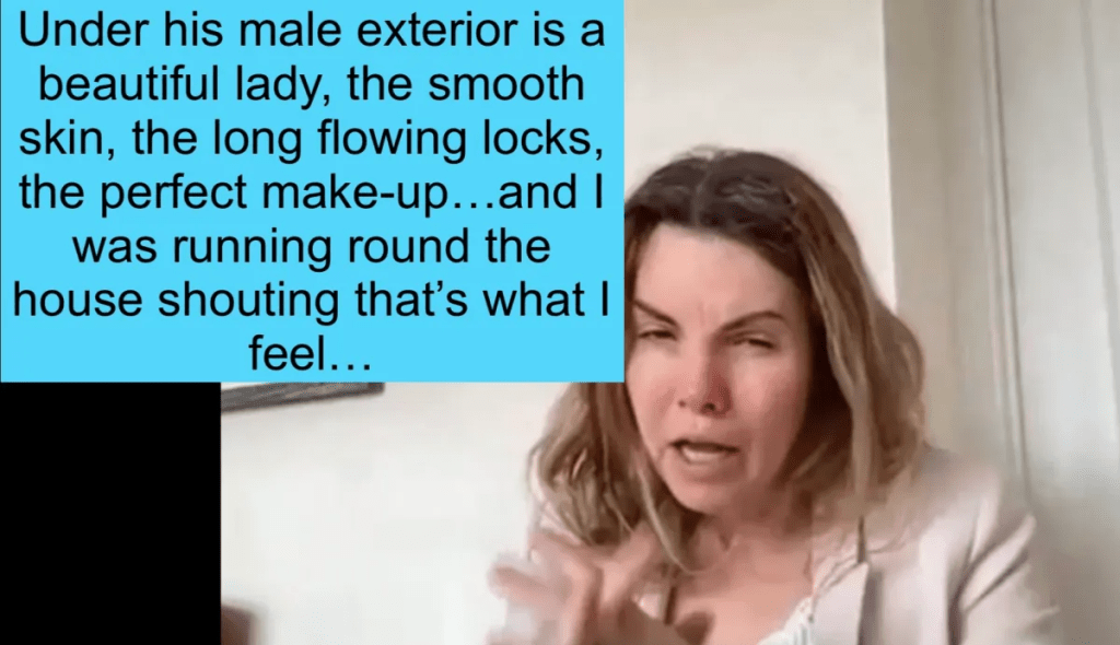 Jacqui then talks about how self-conscious they feel using female facilities even though they have had a ”full transition”. Maybe this reflects some subconscious (or conscious) awareness they are violating women’s boundaries and women are undressing because they think they are in an all female facility?