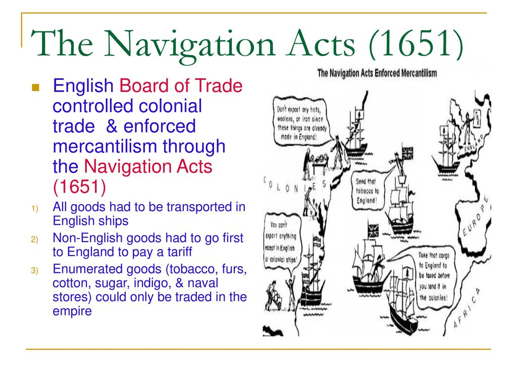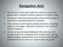 The Navigation Acts, or more broadly the Acts of Trade and Navigation, were a long series of English laws that developed, promoted, and regulated English ships, shipping, trade, and commerce between other countries and with its own colonies