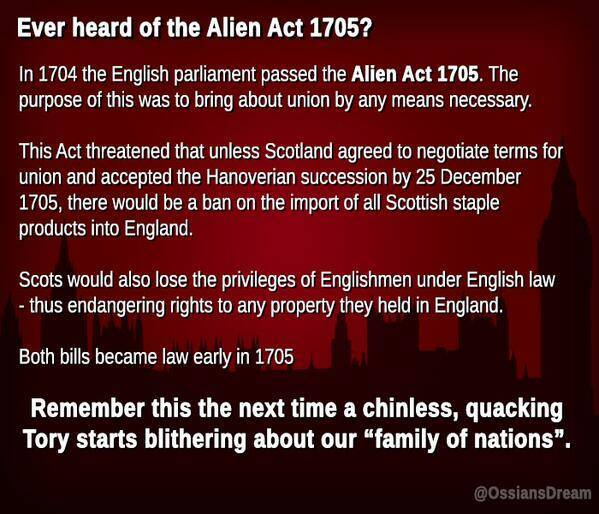 The English Parliament’s Alien Act of 1705 speeded up the process of a Union with Scotland with the explicit threat to confiscate all Scottish held estates held in England by non-residents unless the Scottish Parliament entered into treaty negotiations by Christmas Day 1705.