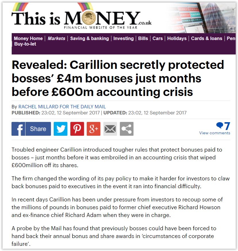 Financial clawback conditions for executive bonuses were significantly relaxed by the Tory government in 2016 with result that top managers gain financial benefit from the collapse of the organisations that they are responsible for.